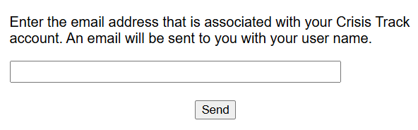 For a forgotten password, enter your username and click Send. An email with a temporary password will be sent to the email address associated with your account. To reset your password, follow the steps in the Log In page, as you did for setting a new password when you first accessed Crisis Track.