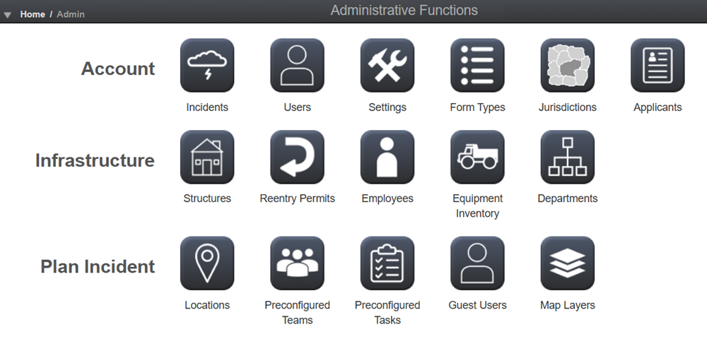 Account - these modules focus on Crisis Track-wide account elements, such as incidents, users, jurisdictions, and settings.