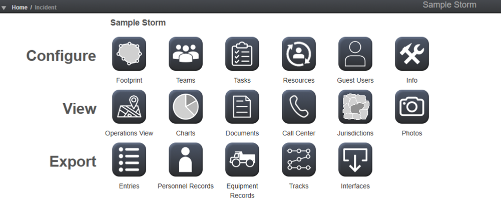 Export - these modules focus on viewing and exporting data from Crisis Track, such as exporting entries, personnel and equipment records, and tracks.