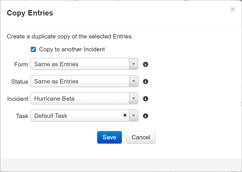 • Copy: Admins can now copy entries from one incident to another. You can copy entries individually or in bulk, through both the Entries and Tasks modules. This is particularly helpful if someone accidentally creates entries in the wrong incident. For more information, see Copy Entries and Copy Entries for a Task.