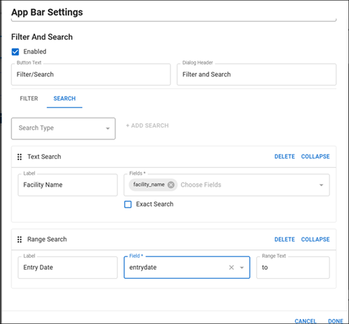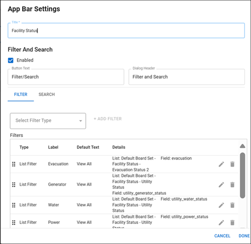 App Bar Settings fields Field Description Valid Value or Example Button Text Text that appears on the filter and/or search button on your board in WebEOC. Up to 200 alphanumeric characters. Dialog Header Text that appears as the header on the window or modal that opens in WebEOC to help you filter or search the data on your board. Up to 200 alphanumeric characters. -