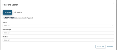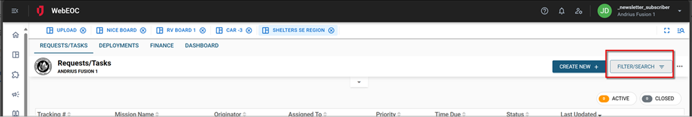 When designing your board, you can add a filter and/or search button that will appear on your board in WebEOC. When you add this feature, you can specify the button name, default values, and other parameters to help users find the information they need on your board. The filter and/or search button is created in DesignStudio, in the List view, and is published along with your board in WebEOC.