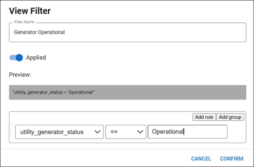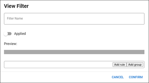 View Filter fields Field Description Valid Value or Example Field name Enter a name for the View filter. Up to 200 alphanumeric characters. Applied Toggle to turn on the View filter for the selected Display view. If the toggle is on, the View filter is applied.