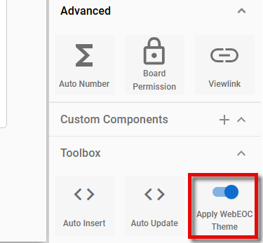 In the Toolbox section, click the Apply WebEOC Theme toggle as needed. A blue toggle indicates that the setting is enabled; a gray toggle indicates that it is disabled.