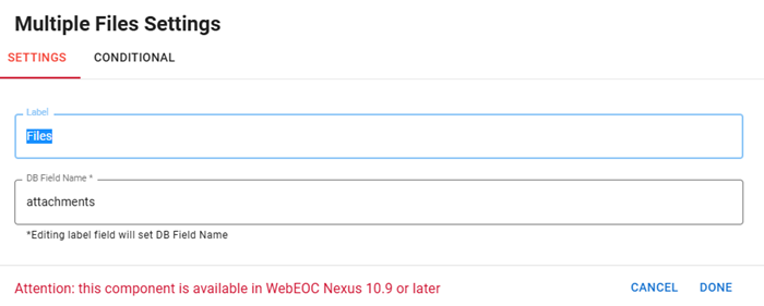 Displays the settings window, in which you can modify the component’s label, database field name, and conditional settings. |