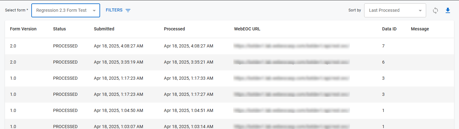 You can view and track form submittals received in WebEOC. A submittal is generated each time a form is completed and includes key details such as the form version, submittal status, submission and processing timestamps, and the target WebEOC URL.
