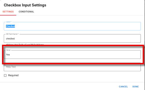 In the Board workspace, we have added a Value attribute to the Checkbox component so you can designate a custom value when the checkbox is selected. This Value attribute is added automatically in Code Mode and is saved in WebEOC when a user adds a record with the checkbox selected. See Checkbox Component for more details.