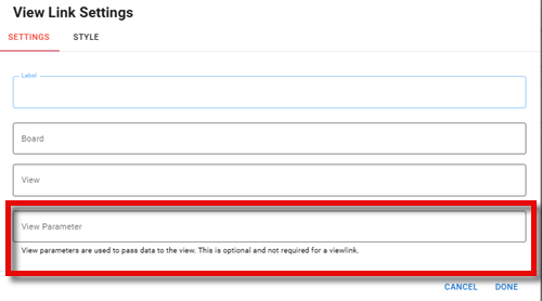 We’ve added a new View Parameter setting to the View Link component. This setting allows you to pass data to a view when a user navigates to that view from the board. See View Link Component for details.
