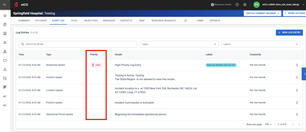 A new Priority column has been added to the Log Entry table on the Event Log page. High-priority log entries are visually indicated by a red priority icon, making important events easier to identify at a glance.