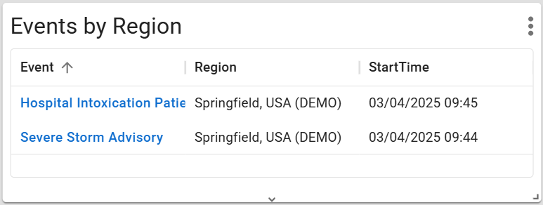 This dashboard widget displays active events by region, including mutual aid regions. When you add or edit this widget, you only need to configure the Title field, which sets the name displayed on the widget.