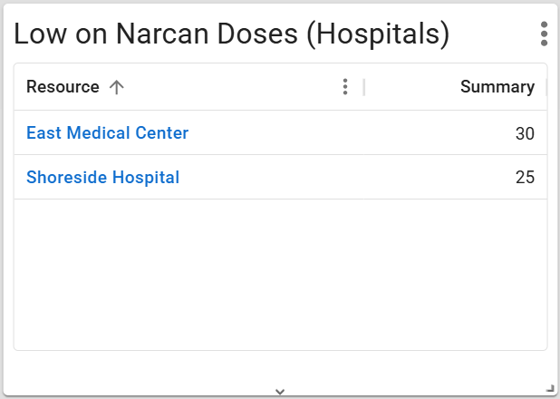 This dashboard widget displays resources in a resource group/type that have a numeric value less than or greater than the selected value. For example, hospitals in a FEMA region that are low on available Narcan doses. You can use Number or Calculated status types with this widget.