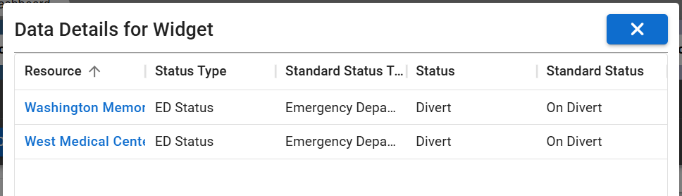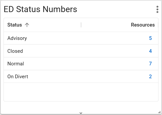 This dashboard widget displays the number of resources in a resource group/type that have each status for the selected Multi status. For example, the number of hospitals in the state with each emergency department status.
