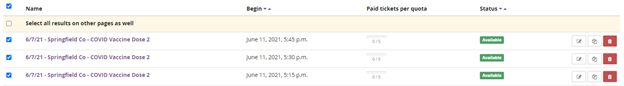 Timeslots in Juvare Events are the blocks of time that are segmented for patient appointments. Timeslots, including the start and end times, duration, items offered, and quantity, are configured by the event creator.