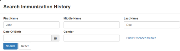 Click Search. If this is a new patient, the search will not return any information. If this is a returning patient, the search will return information about the patient’s previous vaccinations.