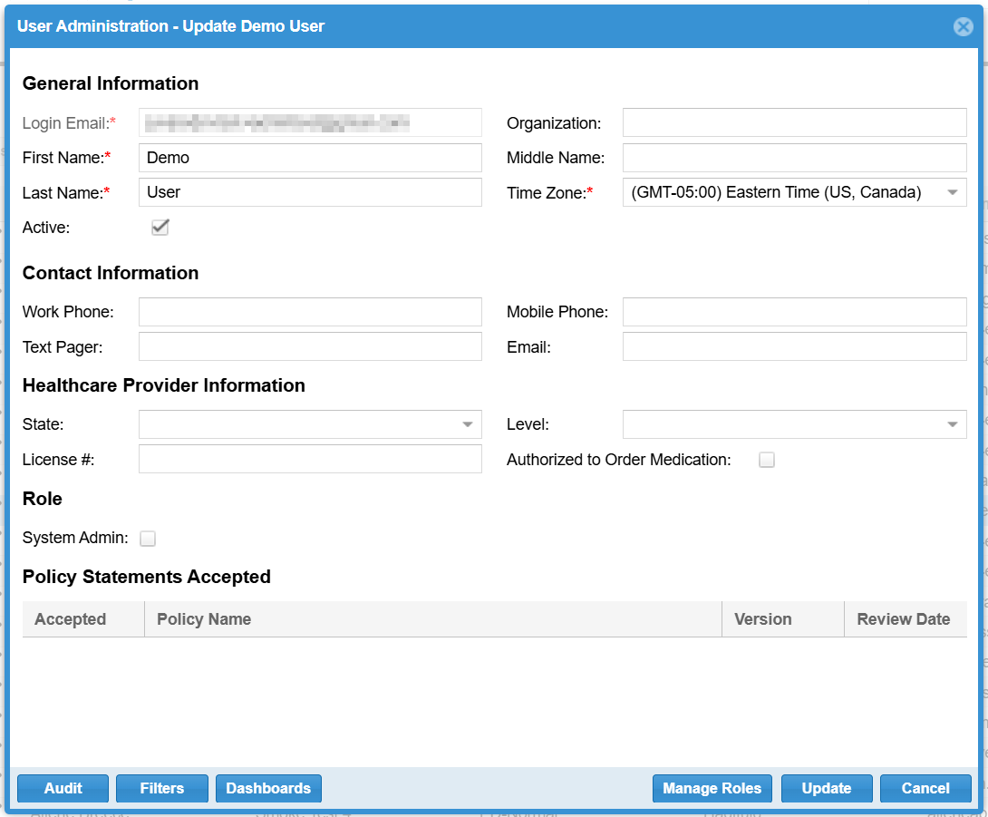 Locate the user you want to reactivate. On that row, click the edit icon. The User Administration - Update window opens.