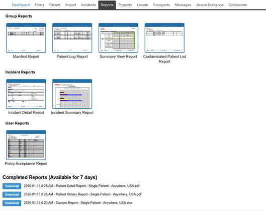 The Custom Report, Patient Detail Report, History Report, and Incident Detail Report now run in the background and display in the Reports tab once completed. Finished reports appear in the Completed Reports section, and all completed reports are automatically deleted after one week.