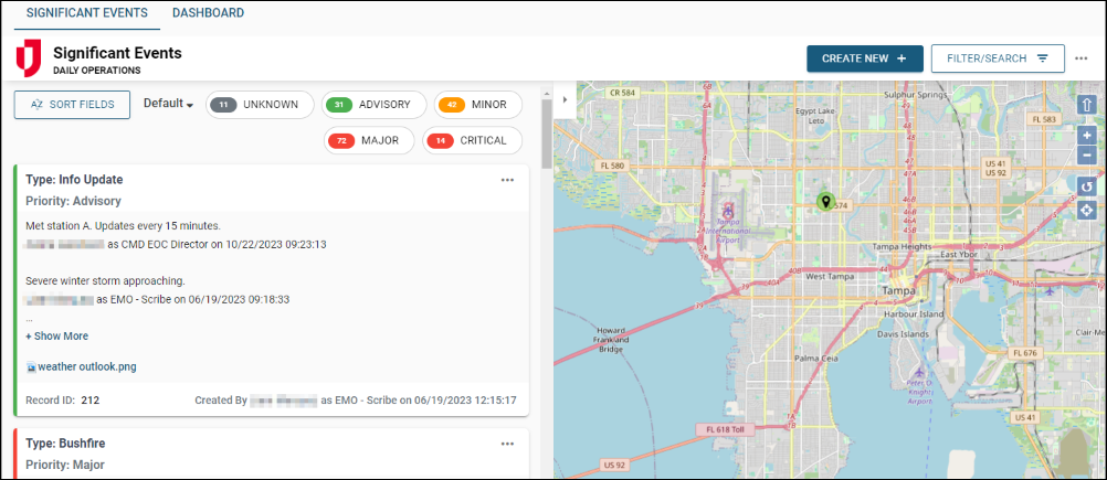 The Event Reporting Board is a map-enabled board that helps you document the incidents and actions taken by personnel in the Emergency Operations Center (EOC) or in the field. This board consists of the Activity Log and Significant Events views, both views include embedded maps to quickly view event locations for improved situational awareness. The Event Reporting board uses a log style view that allows you to expand and collapse records to view more or less information, along with a new Significant Events dashboard and a time-based filter to automatically remove records after a configurable number of hours.