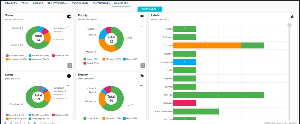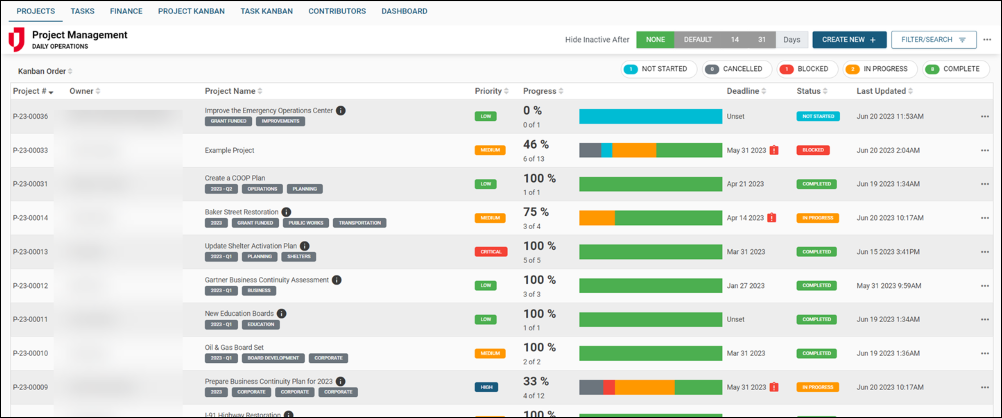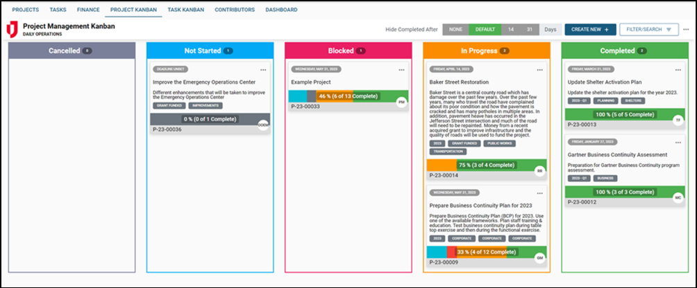 The Project Management Board offers a responsive, mobile-friendly design that helps you create and manage anything from simple daily tasks to complex, months-long projects. Projects and tasks are selected or entered on the fly from the within-board list of contributors, while Unified Command Platform groups, positions, and users can be added as watchers. Multiple interactive views, including the projects list, slide-out, Gantt chart, Kanban boards, and Dashboard, provide critical insight while also allowing you to drill down quickly for specific details or to make updates.