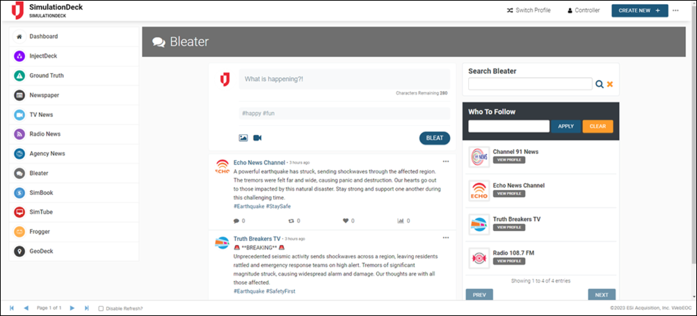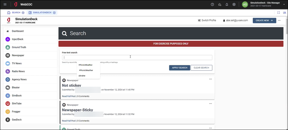 The SimulationDeck Board powers effective training exercises for small, medium, and full-scale operations around the world by replicating the flow of information within Unified Command Platform as simulated online, radio, and television news, blog posts, and social media posts are injected into the board.