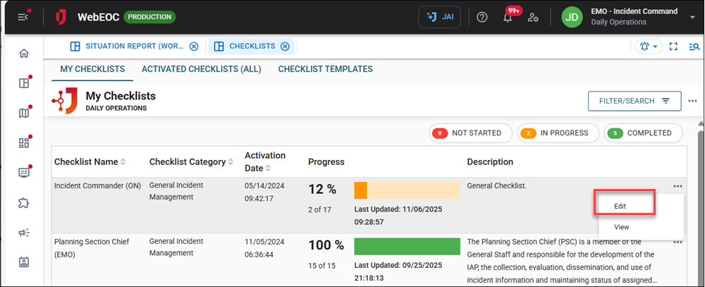 On the Activated Checklists (All) tab, click the ellipsis icon on the right of the record to edit and select Edit.