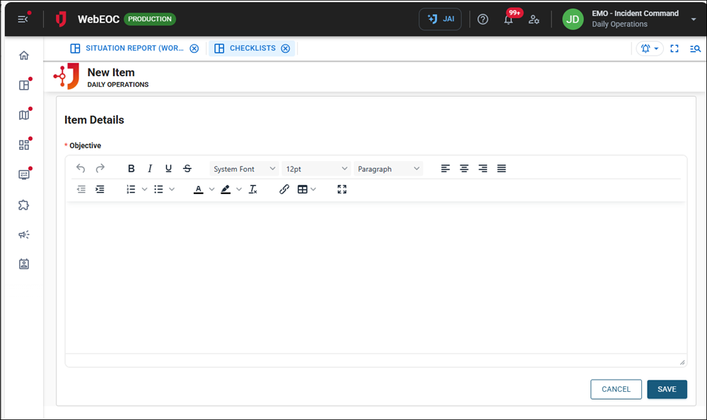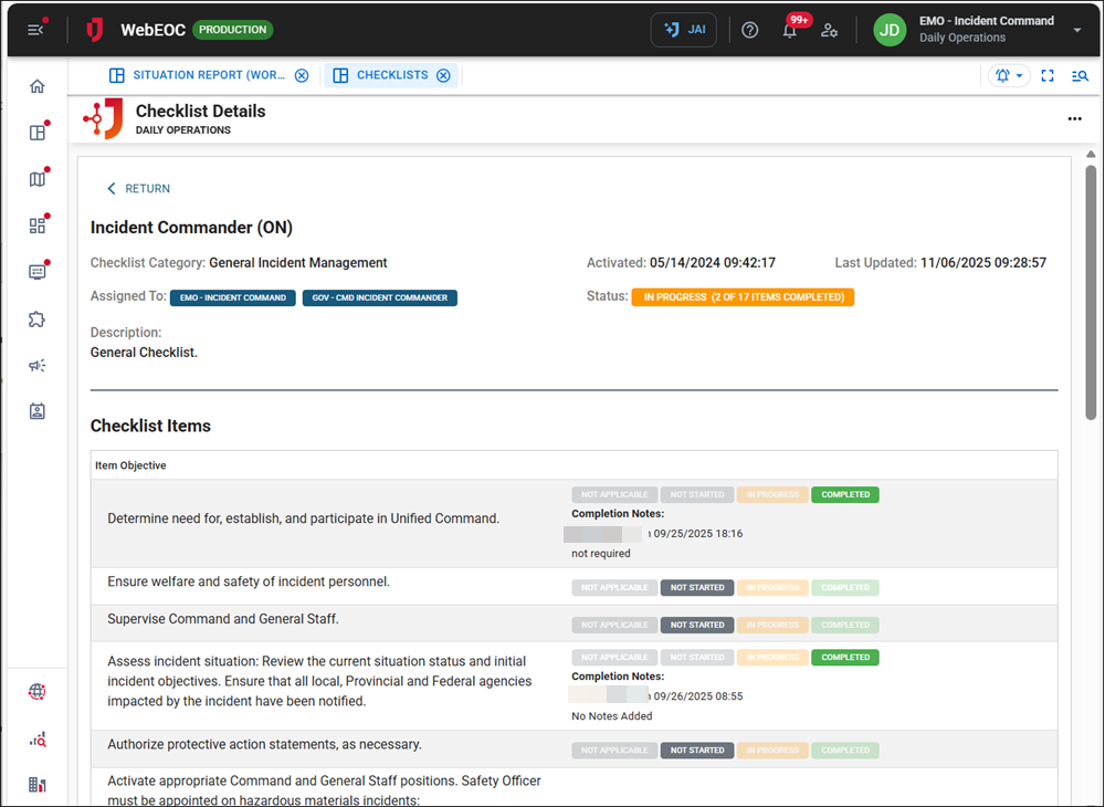 On the Activated Checklists (All) tab, you can update checklist details, add items, and update the status of items.