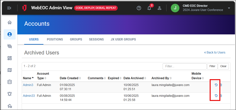 Administrators cannot archive the WebEOC Administrator user account or their own user accounts.