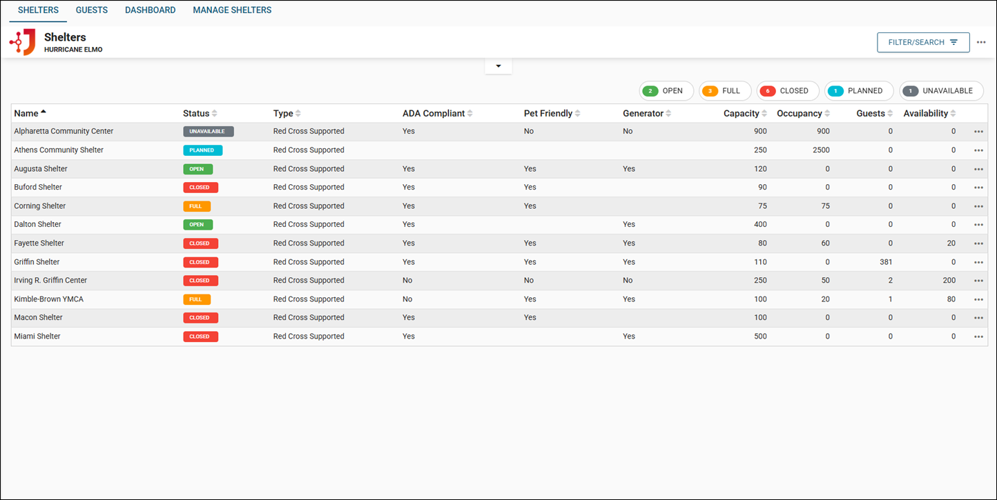 The Shelters with Registration board is a map-enabled board that helps you keep track of shelter information and statuses. The standard list-view displays the shelter’s name, status, occupancy, and view shelter registrants and record their information on check-in. It also indicates whether a shelter houses the general population, accommodates special needs, or is pet friendly.