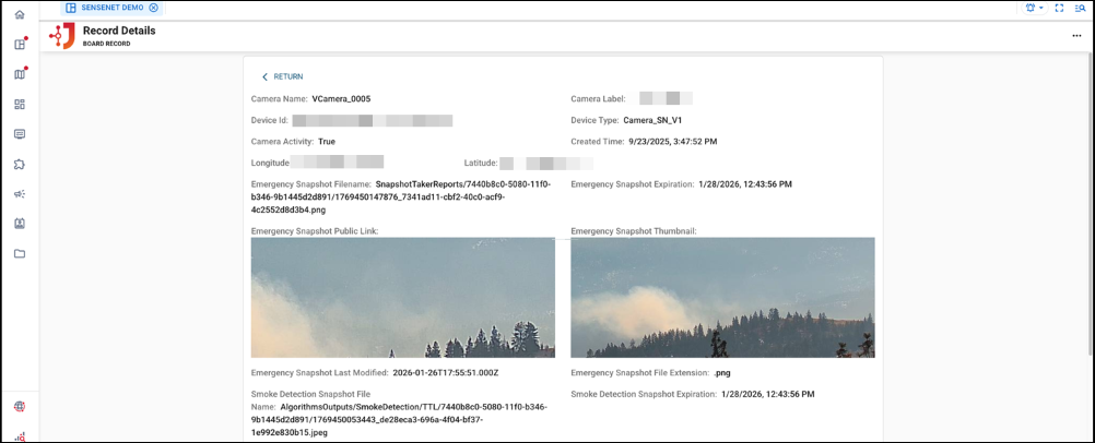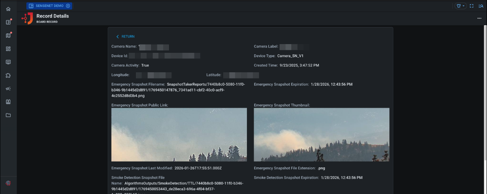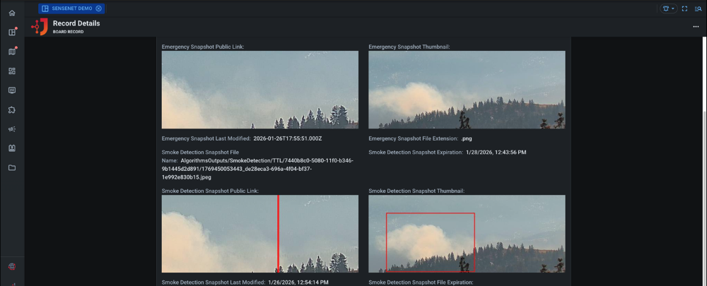 Camera integration: Connect to SenseNet camera feeds for automated smoke detection and emergency snapshots, with support for thumbnails, expiration dates, and public sharing links.