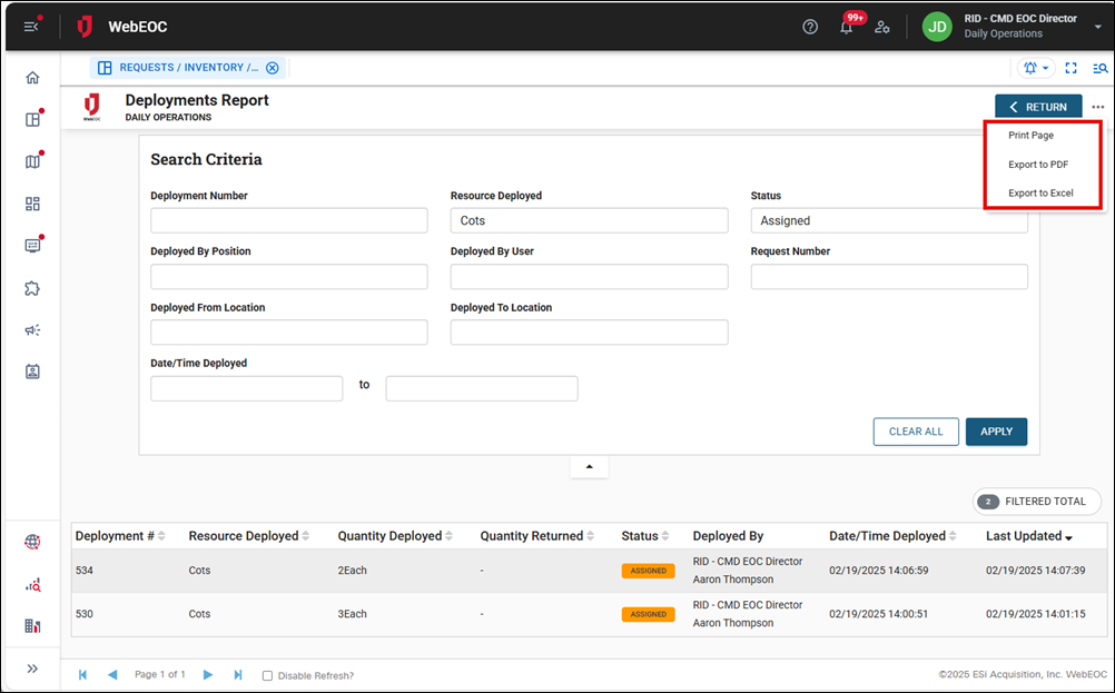 The filtered results are displayed at the bottom of the page. In the example above, the exported report includes all Cots that are in an Assigned status.