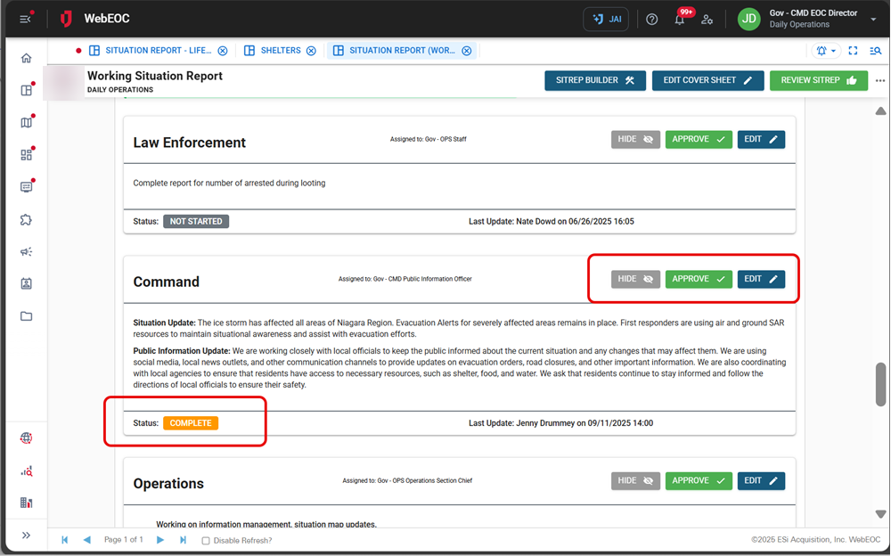 Only those contributors’ sections that have been approved display on the Published Situation Report.