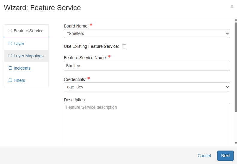 Adding a Feature Service involves adding layers, mapping those layers, associating incidents, and, optionally, applying filters. You can also opt to allow the extension to pull an existing Feature Service instead of creating a new one.