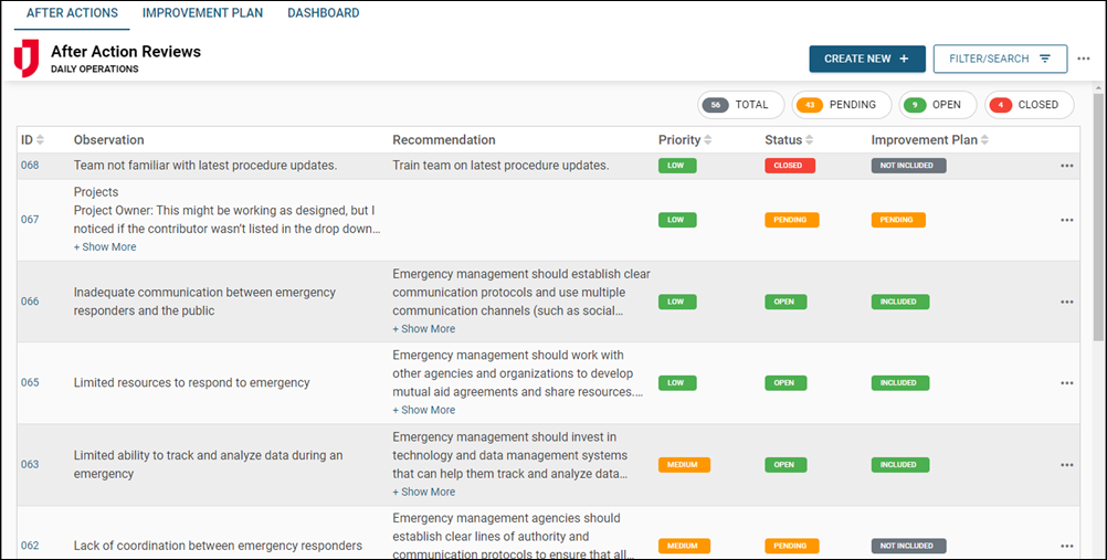 Users can record observations during or after an incident, assign responsible parties for corrective actions, and generate After Action Reports to summarize findings. The board also maintains a historical record for training and future planning.