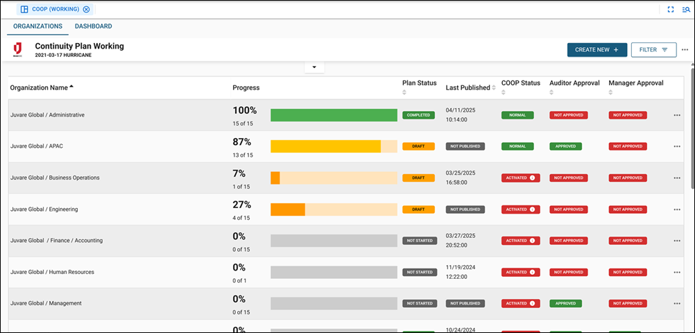 Plan templates and progress tracking: Create pre-populated Continuity of Operations plans, monitor section completion, and track progress visually with a built-in completion bar.