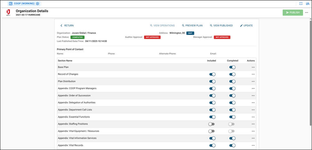 Plan preview: View the entire Continuity of Operations plan in a single, consolidated format before publishing or activation.