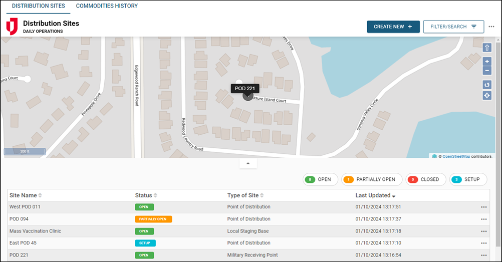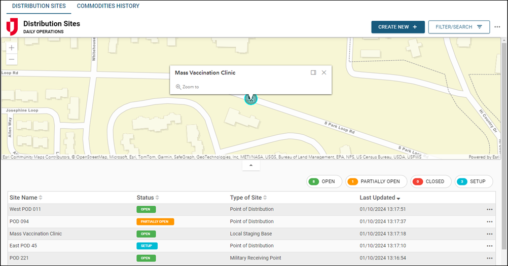 The Distribution Sites board helps emergency managers track and manage the operation of Points of Distribution (PODs), Logistics Staging Areas, and other supply locations. It provides a centralized platform to monitor the flow of commodities, ensuring resources reach affected populations efficiently and equitably.