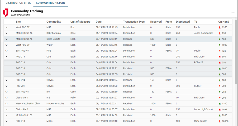 Track commodities: Record available resources, incoming shipments, and quantities distributed at each site.
