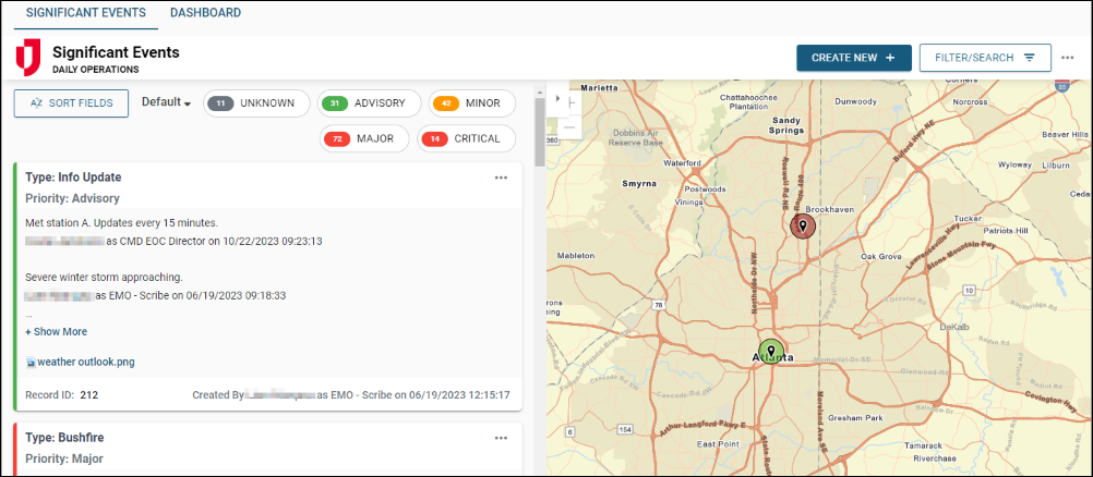 The Event Reporting Board is a map-enabled board that helps you document the incidents and actions taken by personnel in the Emergency Operations Center (EOC) or in the field. This board consists of the Activity Log and Significant Events views, both views include embedded maps to quickly view event locations for improved situational awareness. The Event Reporting board uses a log style view that allows you to expand and collapse records to view more or less information, along with a new Significant Events dashboard and a time-based filter to automatically remove records after a configurable number of hours.