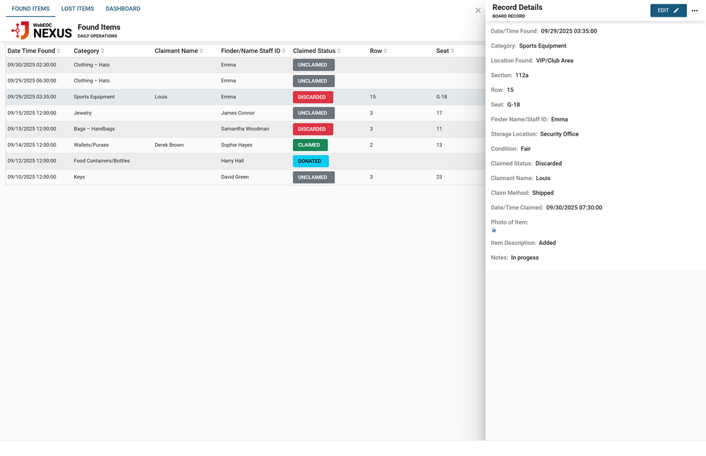 The Lost and Found board provides an organized, accountable process for managing guest-reported lost items and venue-recovered property. It enhances customer service by streamlining how staff log, track, and reconcile items, while also supporting security and compliance through detailed recordkeeping.